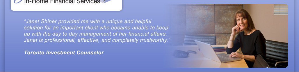 I began In-Home Financial Services in 1998 as I recognized the need in my own family of mature people who are left alone after a death or a divorce to keep up with all the overwhelming financial organization required that their spouse used to take care of. I assisted family members, then non-family members, who do not have the time, desire or expertise to organize every piece of mail that comes to their home, but yet want to remain completely independent and in control of their finances.